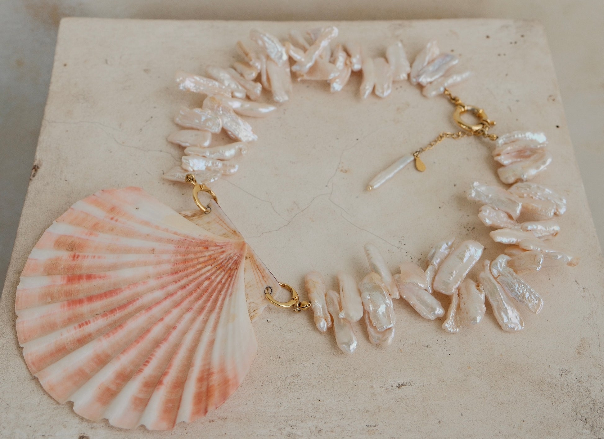 • Matériaux : Coquille Saint-Jacques naturelle rosée & perles d’eau douce irrégulières